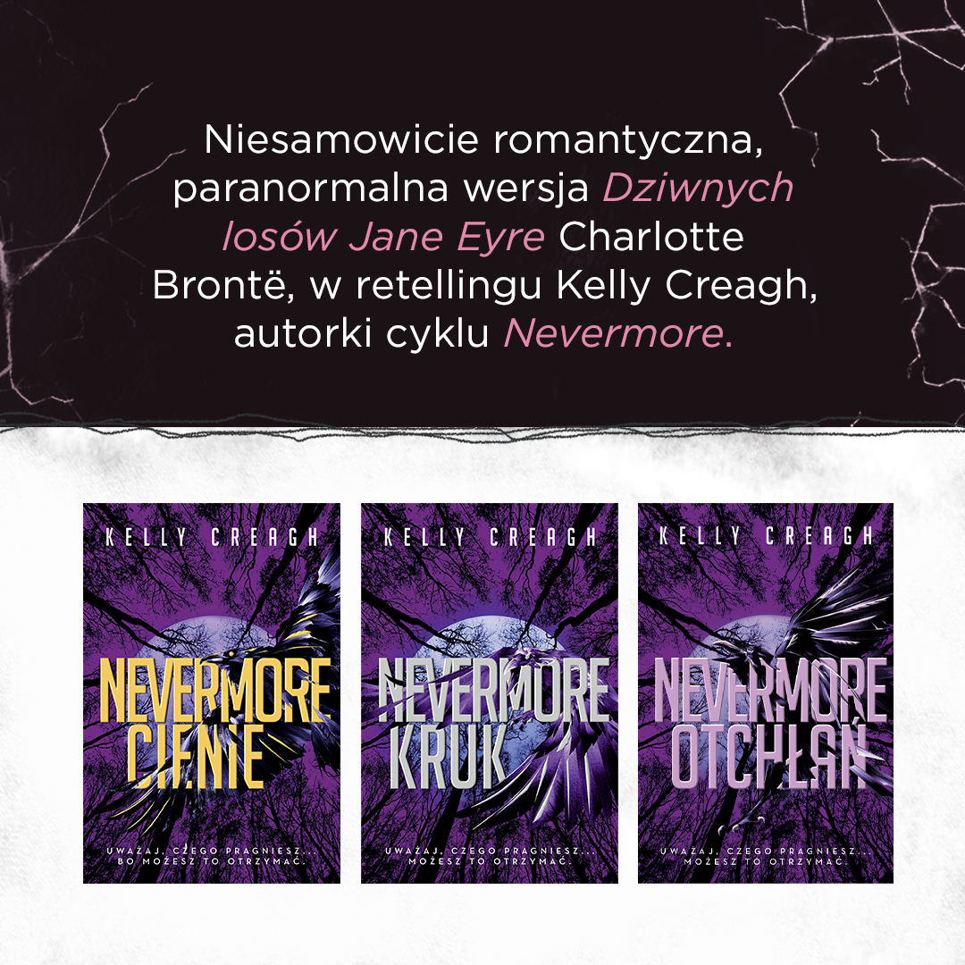 Niesamowicie romantyczna, paranormalna wersja Dziwnych losów Jane Eyre Charlotte Brontë, w retellingu Kelly Creagh, autorki cyklu Nevermore.